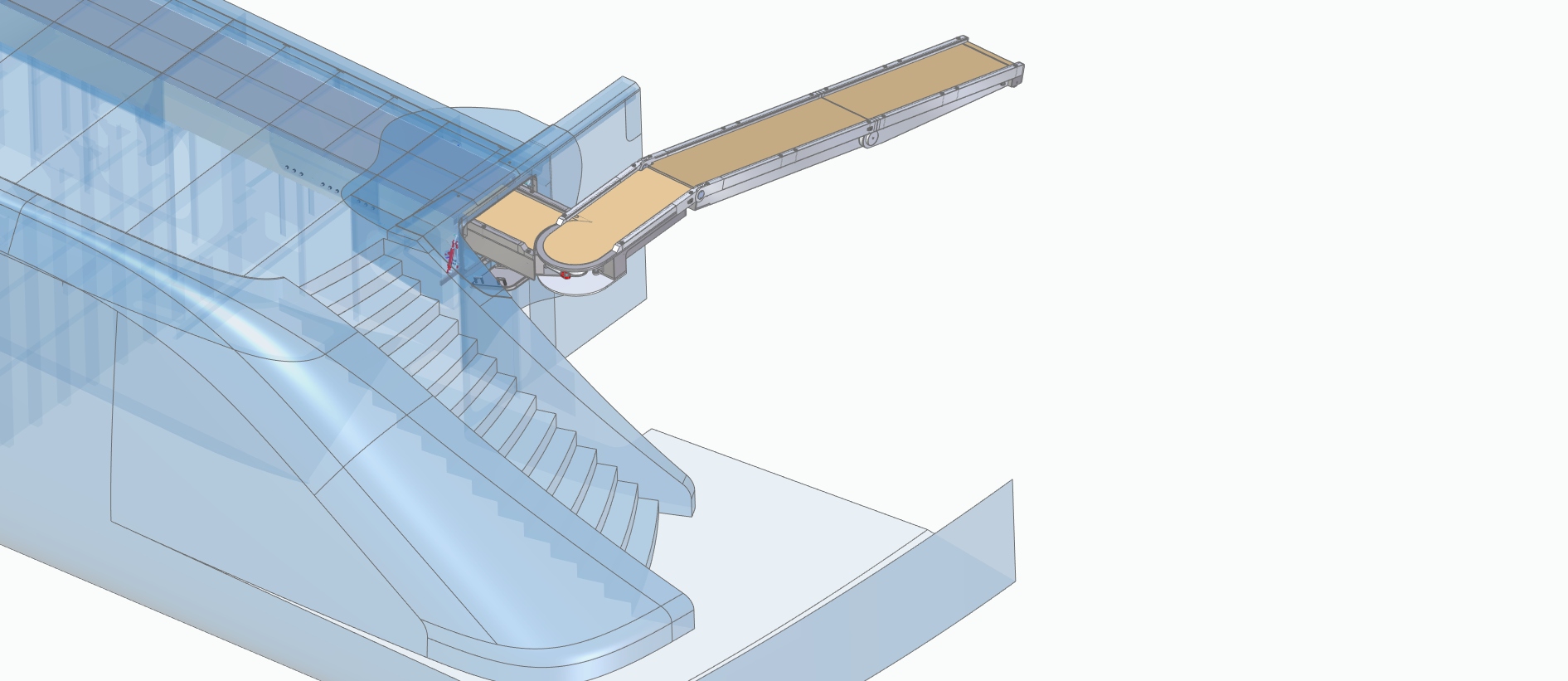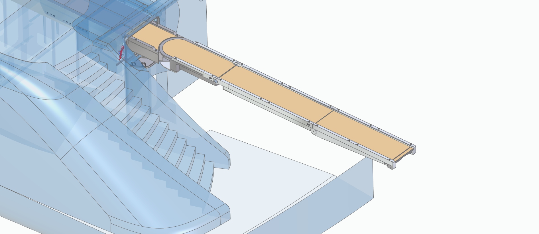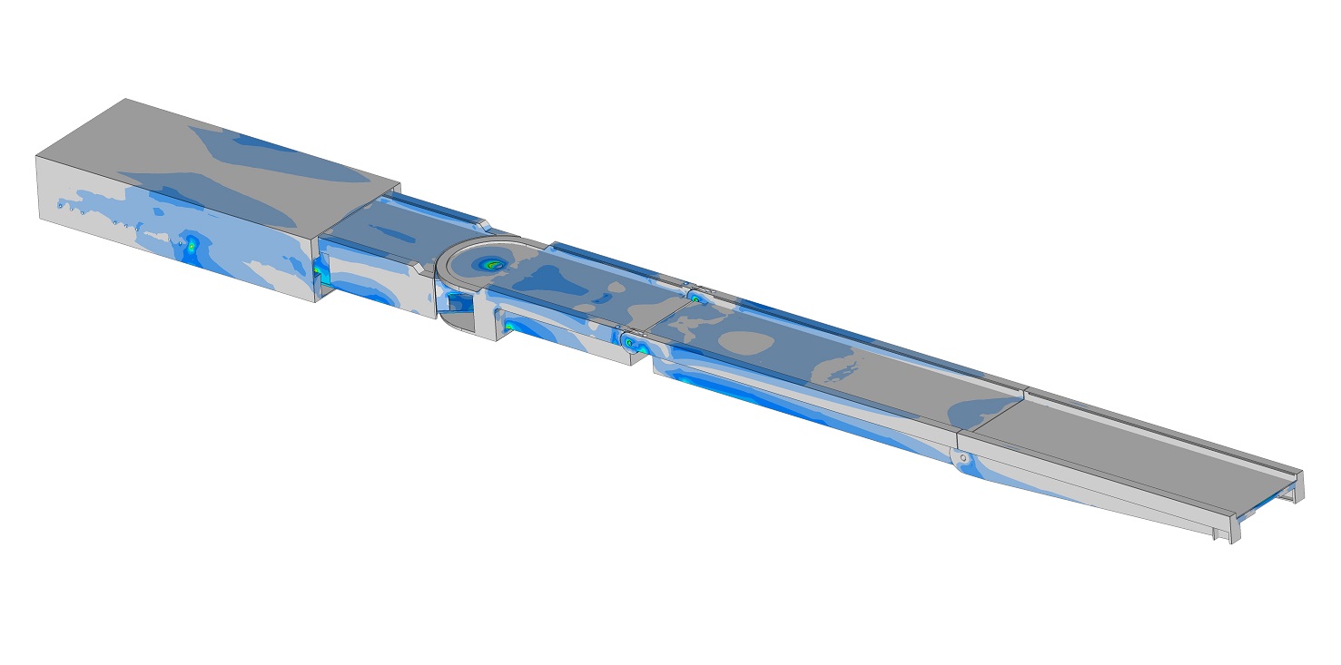 Bright Engineering was asked to do the FE calculations for a gangway for a super yacht. The gangway completely retracts in the back of the yacht's hull. After moving it out from the back of the ship it can be rotated to angles up to 90 degrees. It also can bend down to just above the quay side for easy access to the ship. The strength was checked at different positions.
