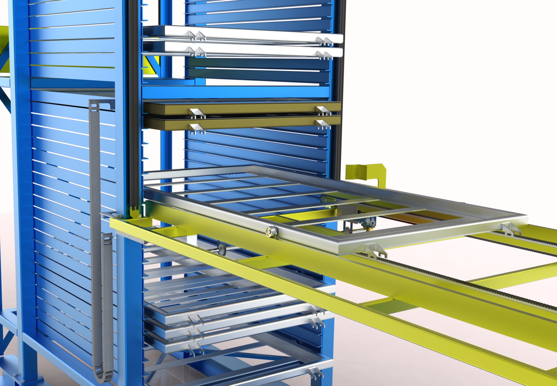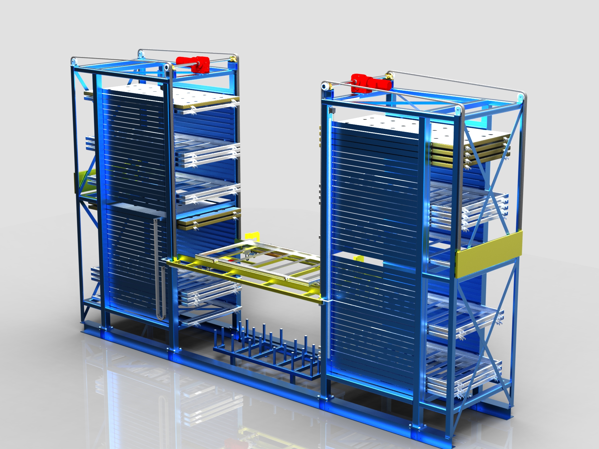 Bright Engineering designed this completely automated plate rack. It has a very large storage capacity. It is designed to store metal sheets and other plate material. It contains 84 storage slots with the capacity to store items weighing up to 2.5 tons and measuring up to 3000 x 1500 x 70 per slot. Each slot is provided with a tray which is used to store/retrieve the items. We also performed the CE check to ensure the design conforms to the European certification criteria.