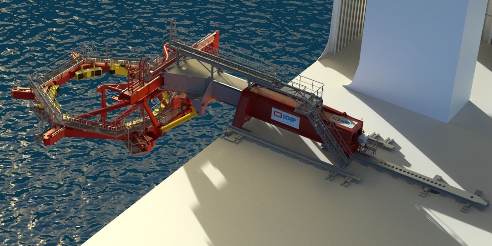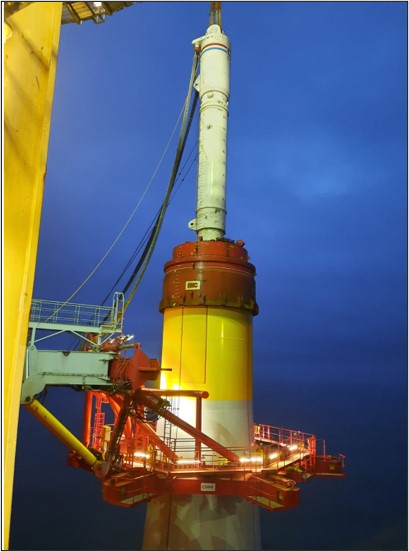 For transport, the Monopile Gripper is rotated upwards and the combination of the Monopile Gripper and NMS Guiding Tool is skidded onto the deck of the jack-up vessel.