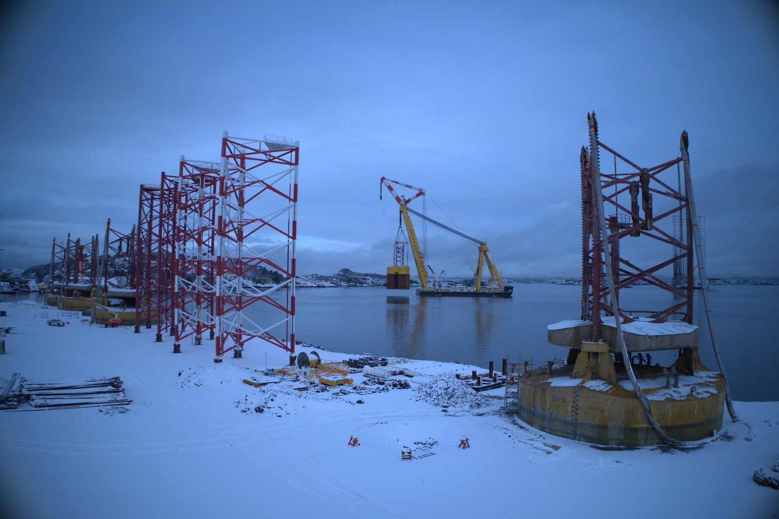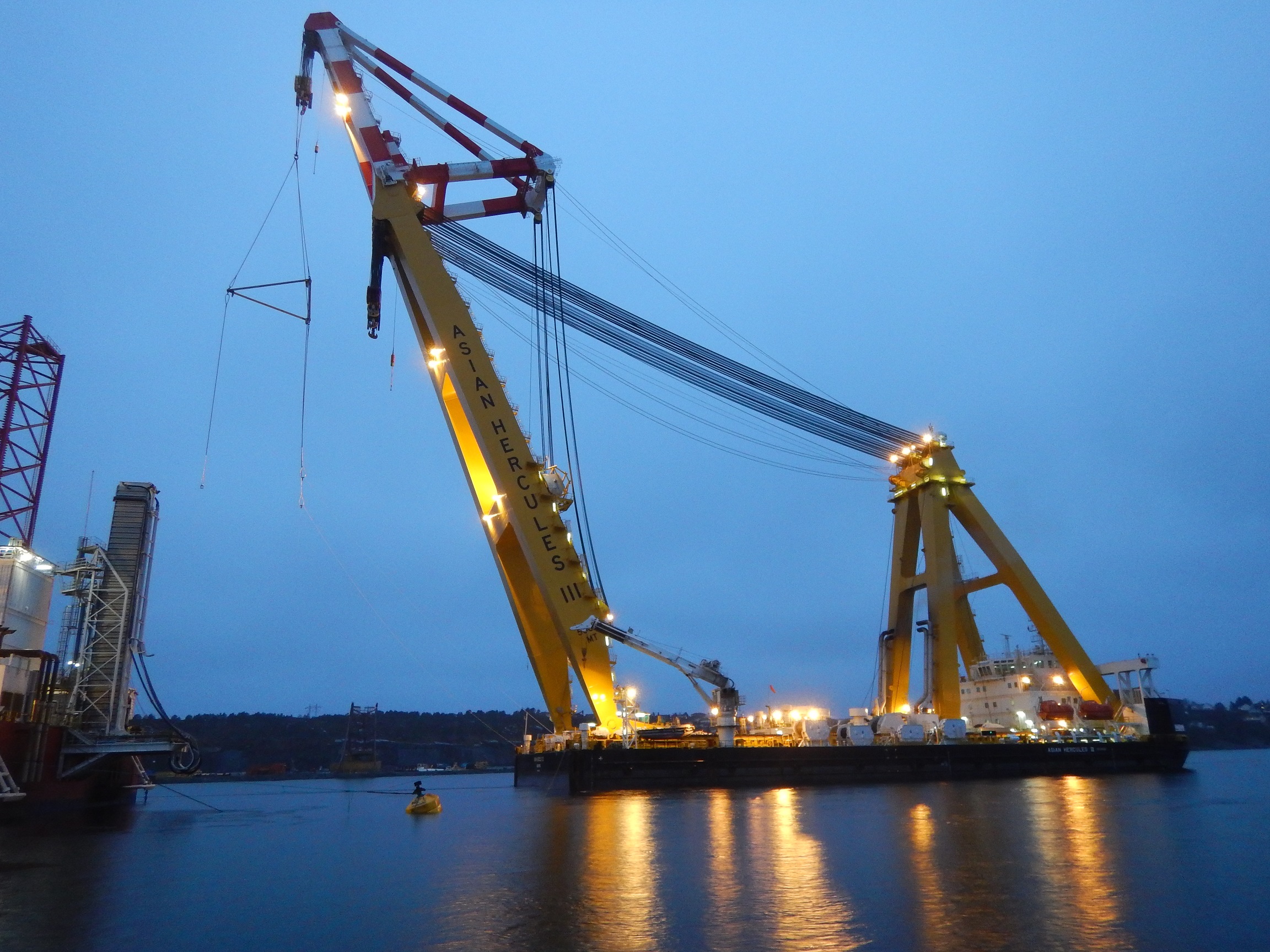 For exchanging the legs of a jack-up vessel, Bright Engineering designed two spreader frames. One frame for the heaviest sections and one frame for use on the jib hoist of the shear leg. The work was done in Norway during the winter, resulting in beautiful pictures.