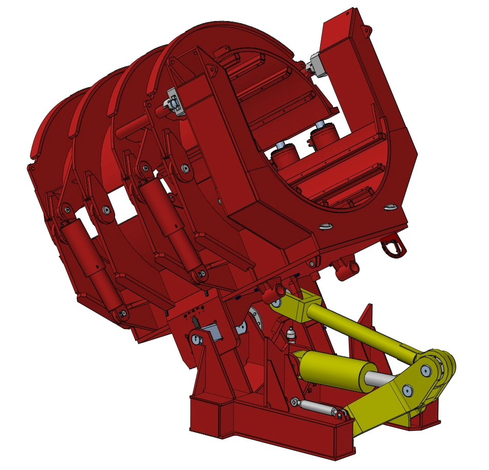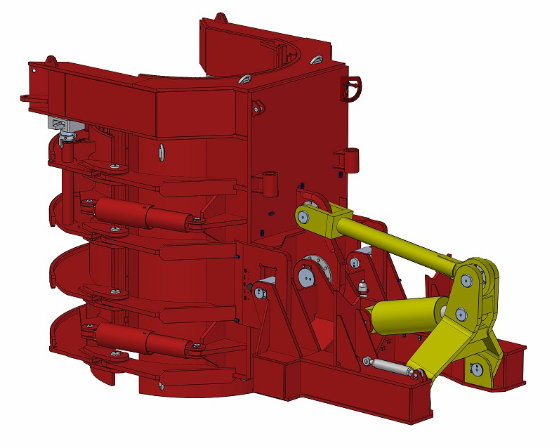 The tilting mechanism is shown in yellow in the CAD pictures. It is driven by one hydraulic cylinder. The new tilting mechanism provides massive time savings during offshore operations.